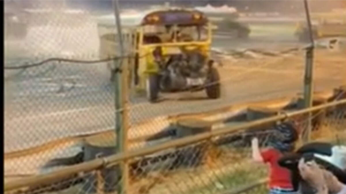Spectators at the Zombie School Bus Races had a scare when one of the buses lost control and came barreling toward them. Dramatic video captured the moment the bus went spinning off the track at the Sportsdome Speedway in Clarksville, Indiana and right toward a young boy who was watching the action near a fence.