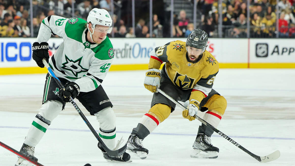 Fredrik Olofsson #42 of the Dallas Stars skates with the puck against Chandler Stephenson #20 of the Vegas Golden Knights in the third period of Game Five of the Western Conference Final of the 2023 Stanley Cup Playoffs at T-Mobile Arena on May 27, 2023 in Las Vegas, Nevada. Photo: Getty Images